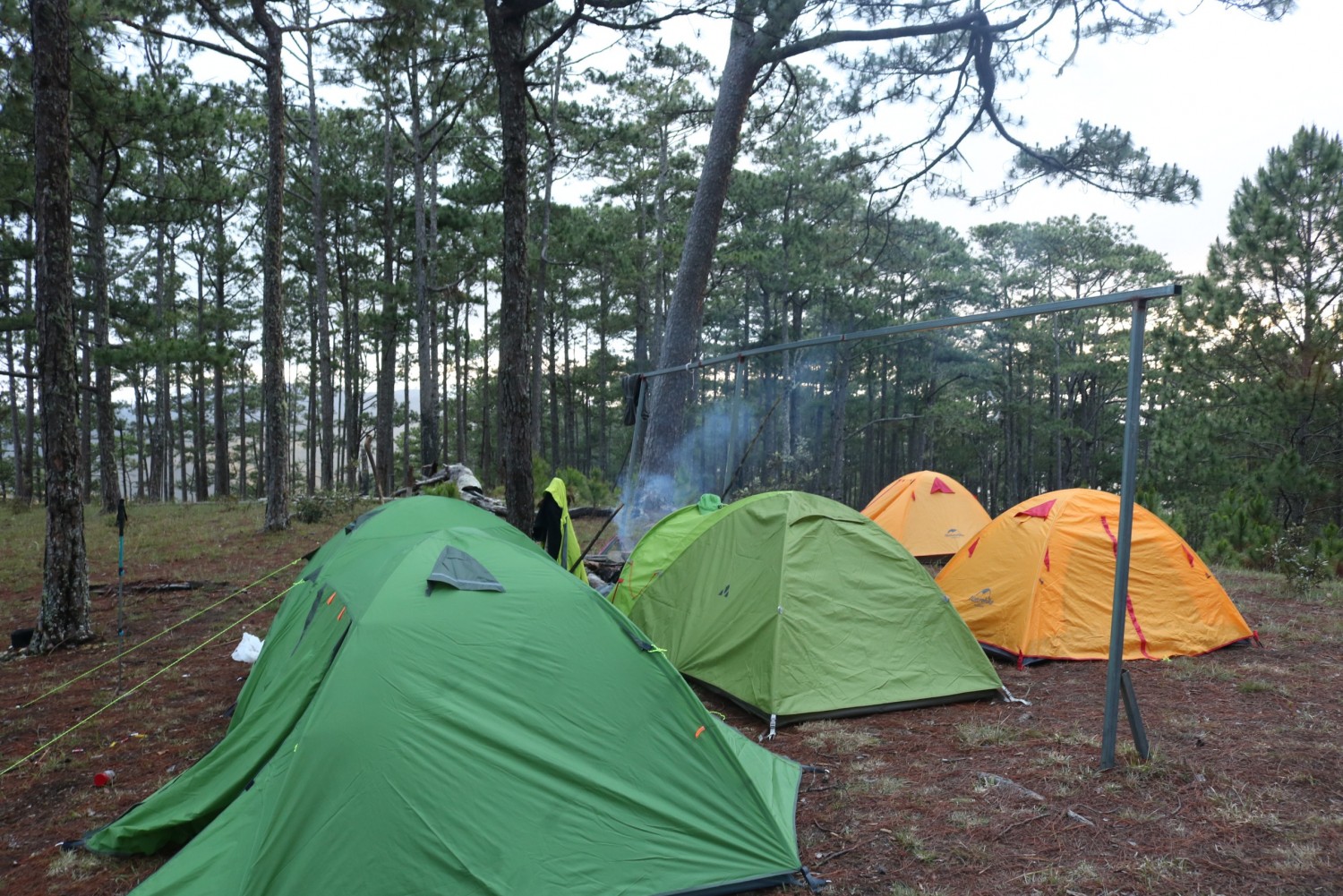 Sau đó chúng tôi đi tiếp xuống điểm hạ trại ở độ cao hơn 1.900m, từ đỉnh đi xuống theo 1 đường khác, đường dễ đi hơn hẳn, nên sau khoảng 1 tiếng tôi tới được điểm hạ trại ở trên 1 đồi thông đầy thơ mộng.